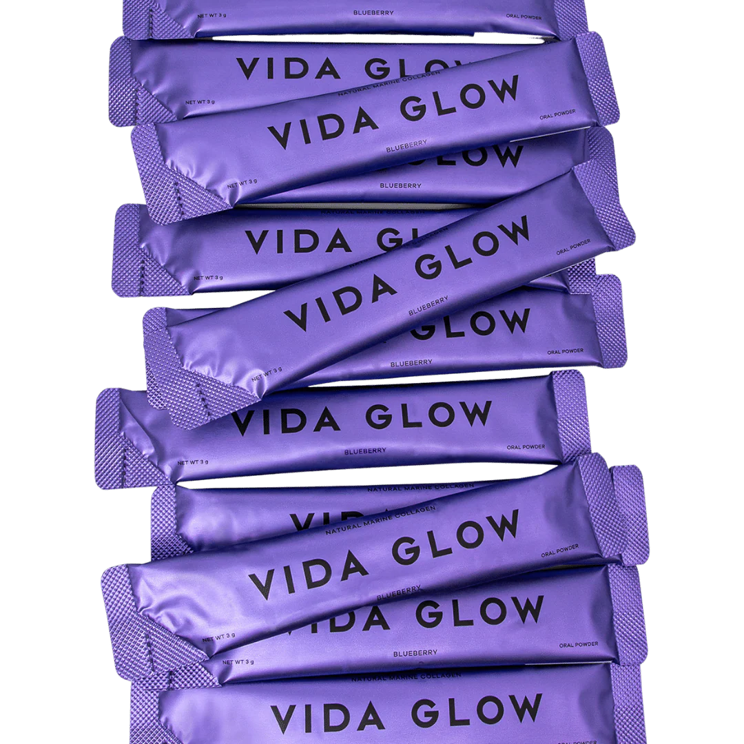 Vida Glow Natural Marine Collagen Sachets are designed to support radiant-looking skin, strong hair, and resilient nails. This supplement provides a convenient way to help maintain your natural beauty and vitality, contributing to overall skin health, a youthful appearance and your body’s natural anti-ageing processes.